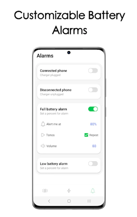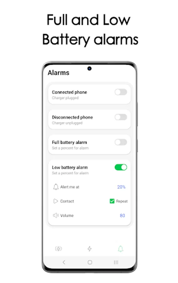 Full battery alarms will notify when your phone reach an amount of percentage to avoid battery damage, also we've a low battery alarm for alert you completely customizable with ringtones, volume, and repeater