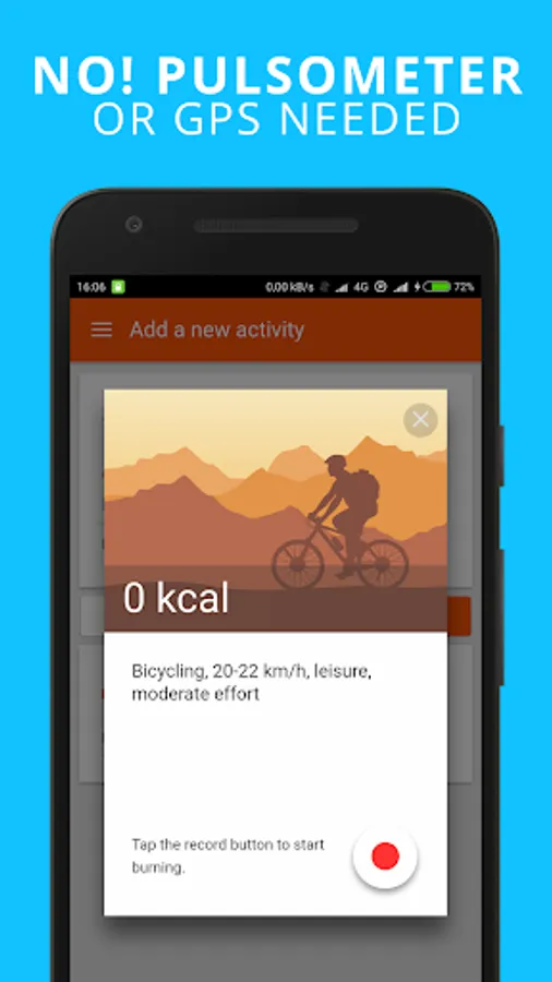 Therefore, this app does not require any additional equipment, such as a pulsometer, pedometer or even using the GPS localization services on your device. The app is amazingly simple to use: just select an activity, tap the "Record" button and watch how many calories you are burning!