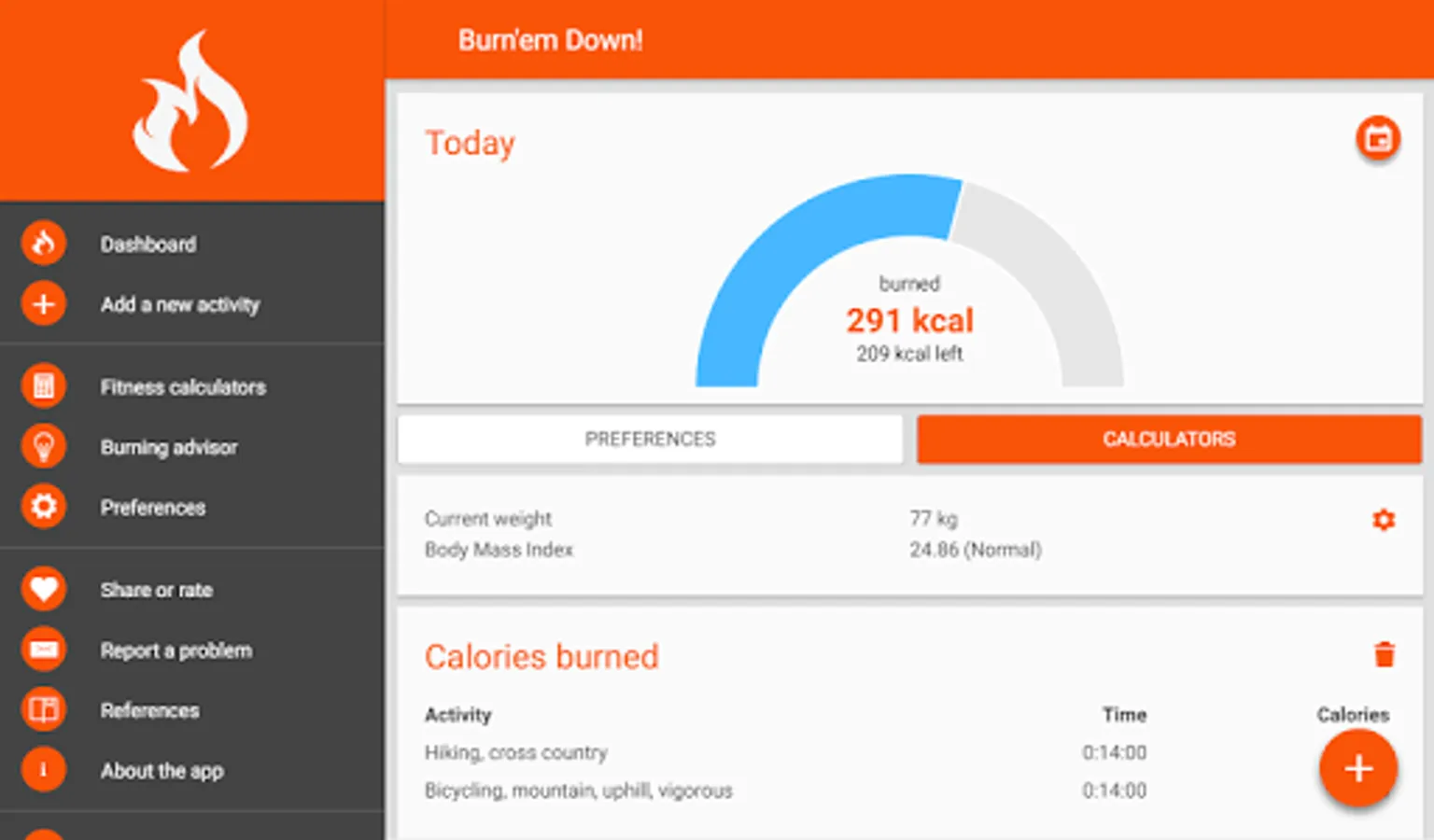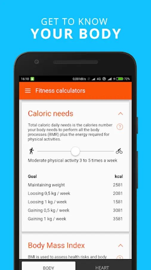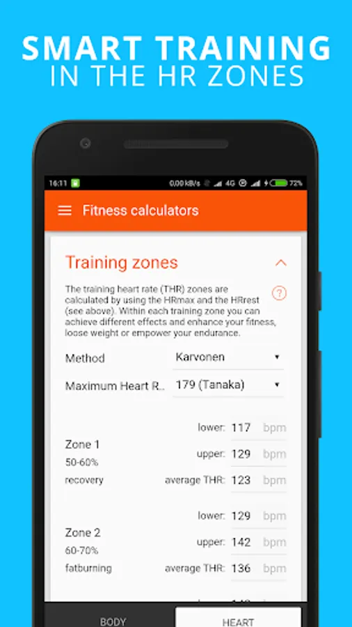 Depending on the types of activity and the user's body parameters, the app uses several formulas, methods and equations to calculate the number of calories burned during different activities. Also, the app is equipped with a number of useful calculators: body fat level, bmi, heart rate, training zones, vo2max and many more.