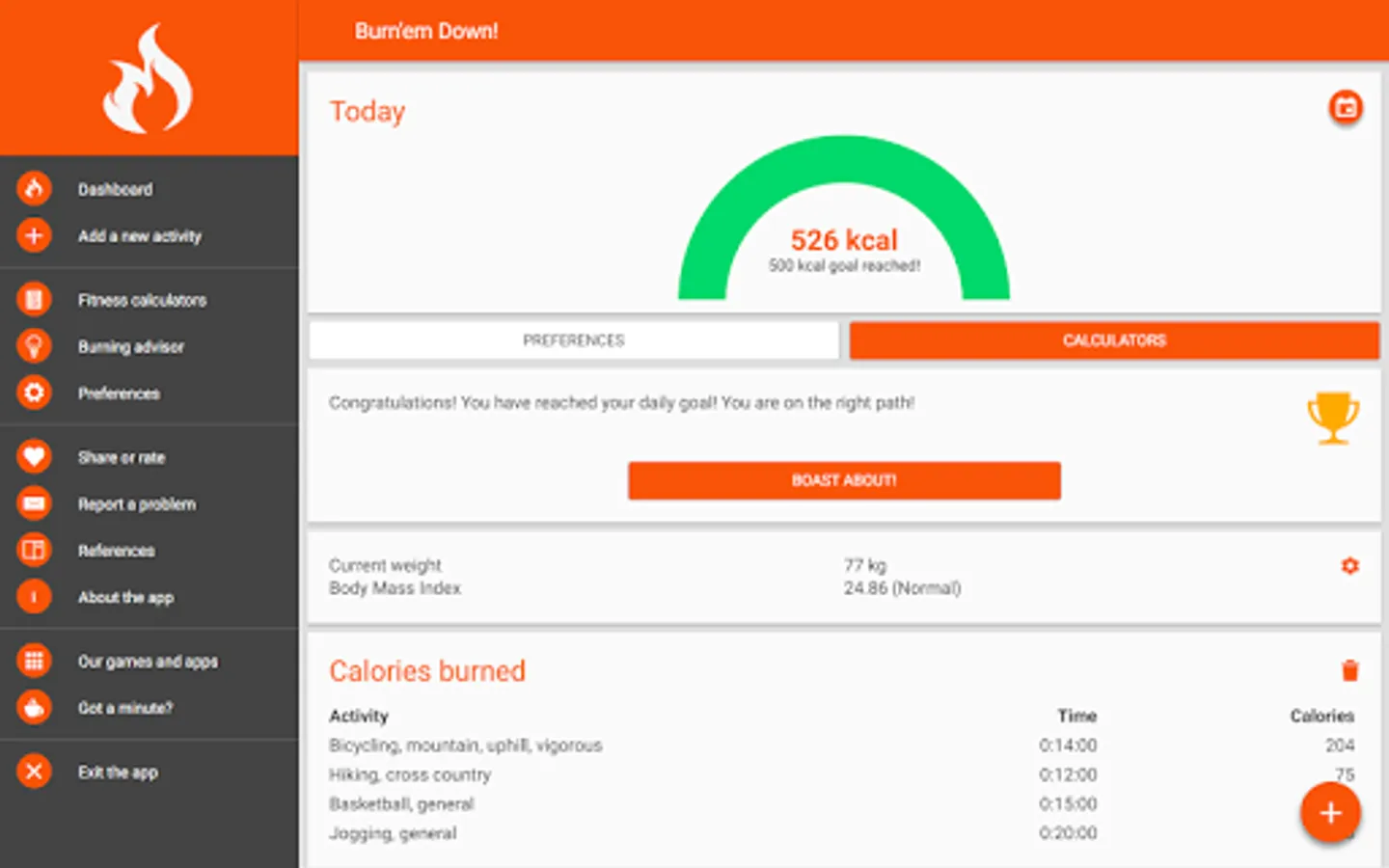 Do you want to burn down some calories? Find out now how! Install the app and use it for free to take control of your calorie burning plans. Burn'em Down! Easier weight loss with a calories and fat burning Advisor. Healthier and fitter living. Fitness calculators. Take care of your weight, know your training zones, set up goals and track your progress. Install now!