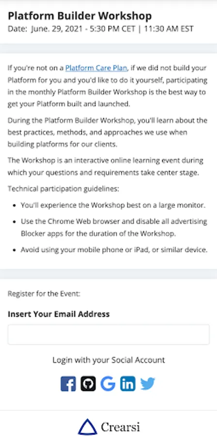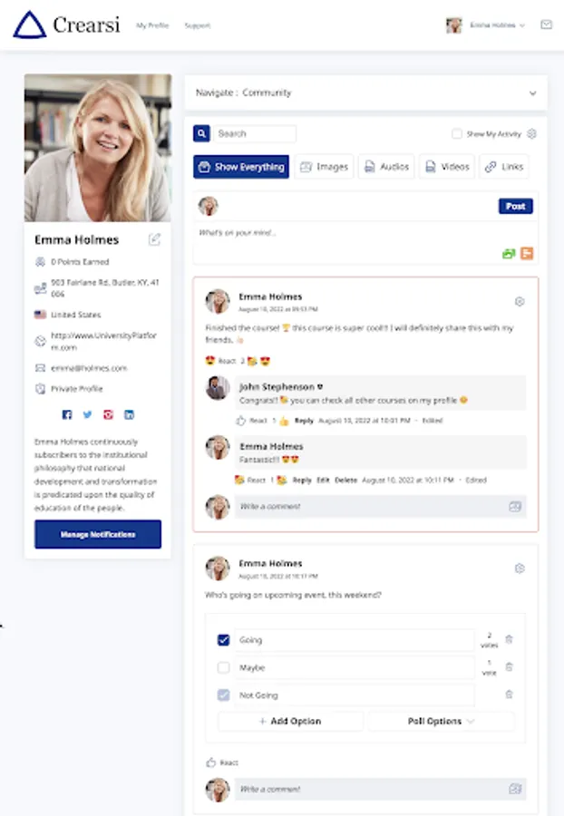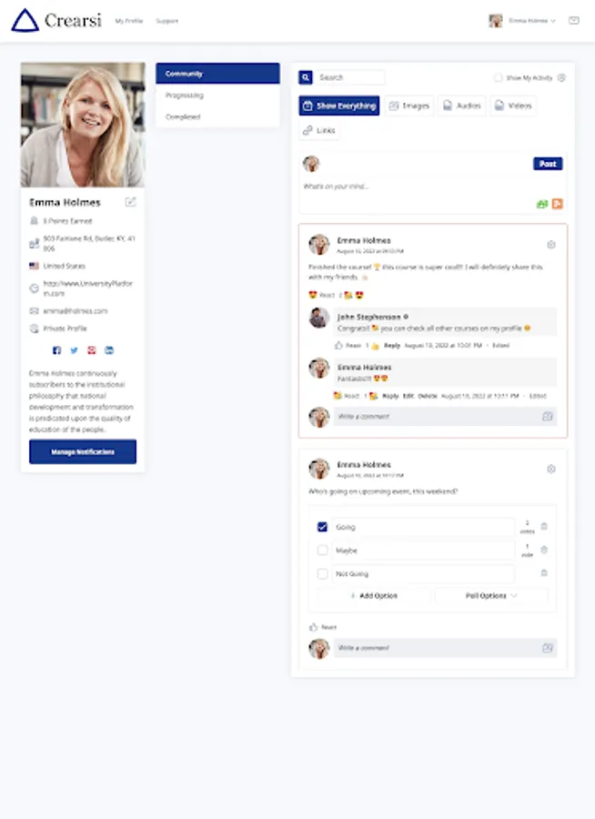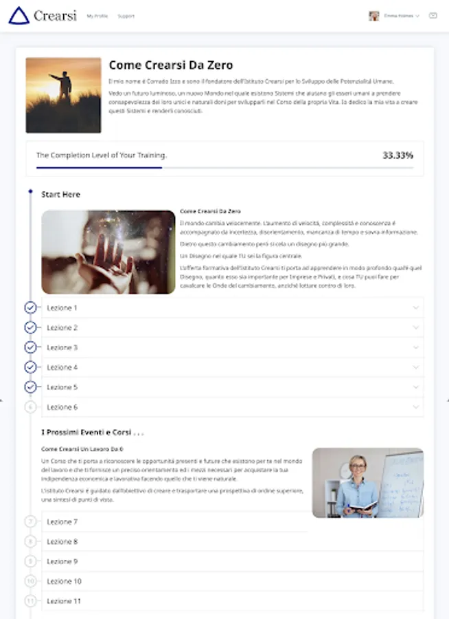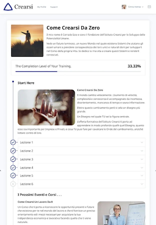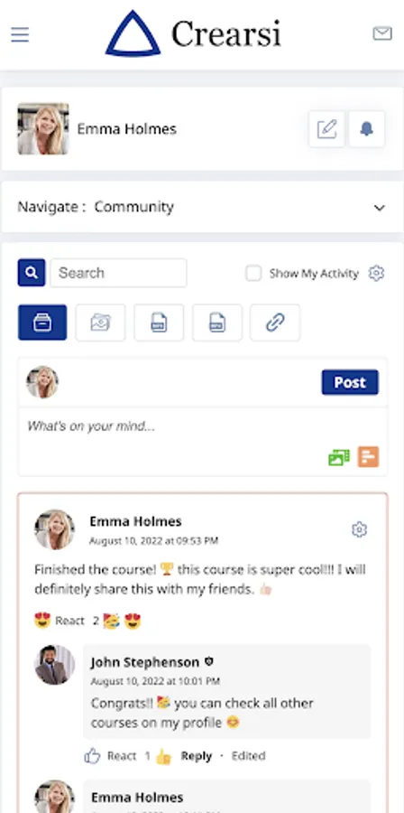The Crearsi Mobile App allows you to access relevant content & conversations quickly, keep track of progress, participate in online workshops and webinars, access content and courses, and so much more.