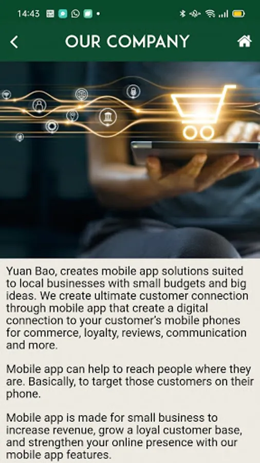 Yuan Bao, creates mobile app solutions suited to local businesses with small budgets and big ideas. We create ultimate customer connection through mobile app that create a digital connection to your customer’s mobile phones for commerce, loyalty, reviews, communication and more.