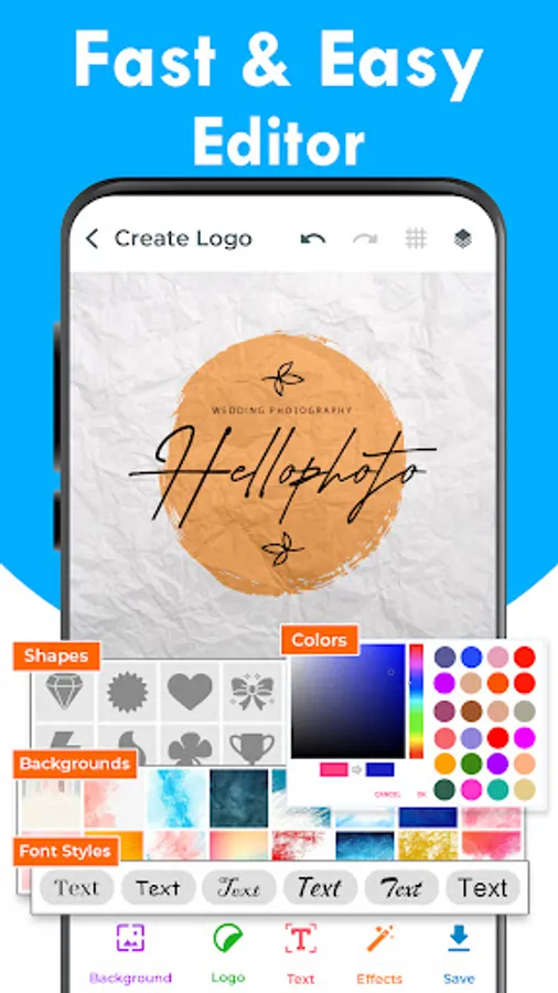 So if you need cool logo ideas then this Logo Maker free app includes a huge collection of Stickers, Graphic Elements, Shapes, Backgrounds & Textures to create an original logo in no time. Logo designing app also provides professional photo editing and text editing tools. Now you can change Font, Flip, Rotate, Resize, Color, Hue and lots more that you'll need to create beautiful original logos.