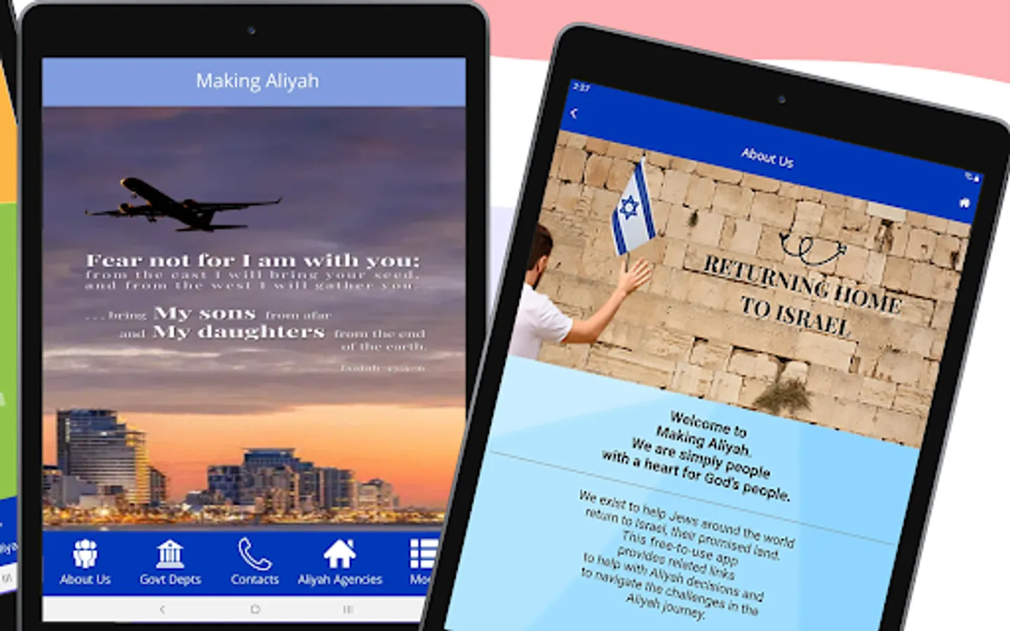 Making Aliyah is totally free for download. It is designed with the intent of helping anyone considering the possibilities of making Aliyah home to Israel. Making Aliyah provides related links to help users make informed Aliyah decisions. These Aliyah-related links are aligned to the key stages of the Aliyah-making process. They have been compiled to help the would-be Olim to navigate the challenges of taking the first steps in their Aliyah journey, to the time they finally arrive in Israel as new immigrants, and ultimately to their successful integration as citizens of Israel.