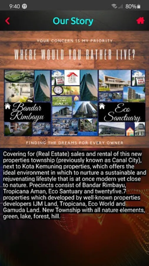 Covering for (Real Estate) sales and rental of this new properties township (previously known as Canal City), next to Kota Kemuning properties, which offers the ideal environment in which to nurture a sustainable and rejuvenating lifestyle that is at once modern yet close to nature. Precincts consist of Bandar Rimbayu, Tropicana Aman, Eco Santuary and twentyfive.7 properties which developed by well-known properties developers IJM Land, Tropicana, Eco World and Gamuda Land.