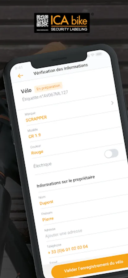 The ICA bike application allows you to finalize your bike files. A QR code allows you to quickly retrieve the file, and validate it after checking the information entered by the customer.