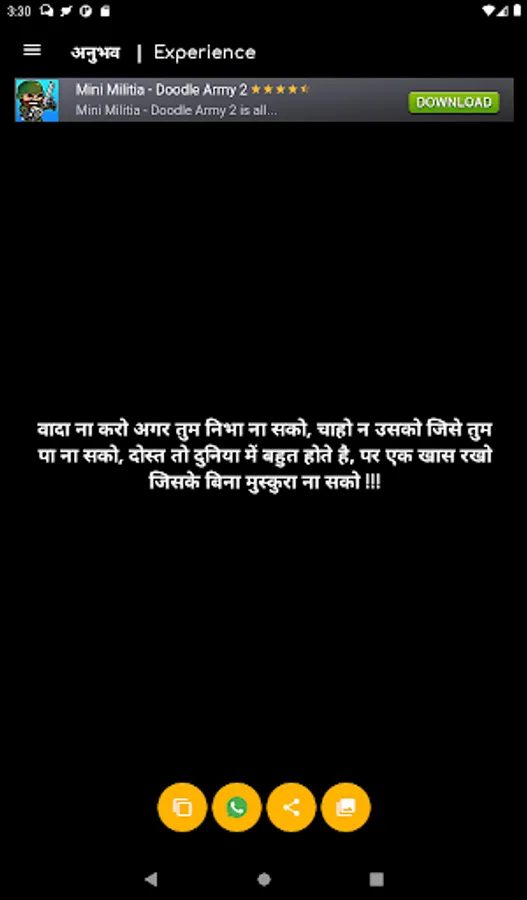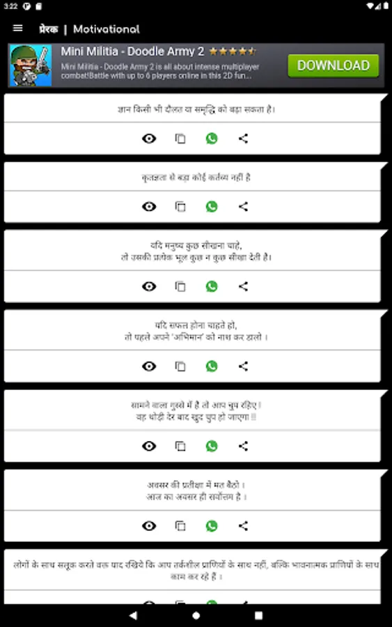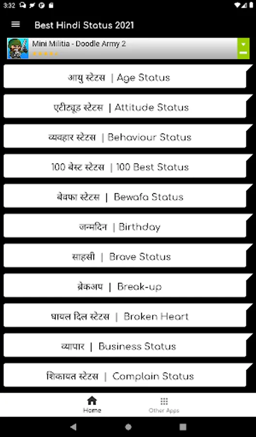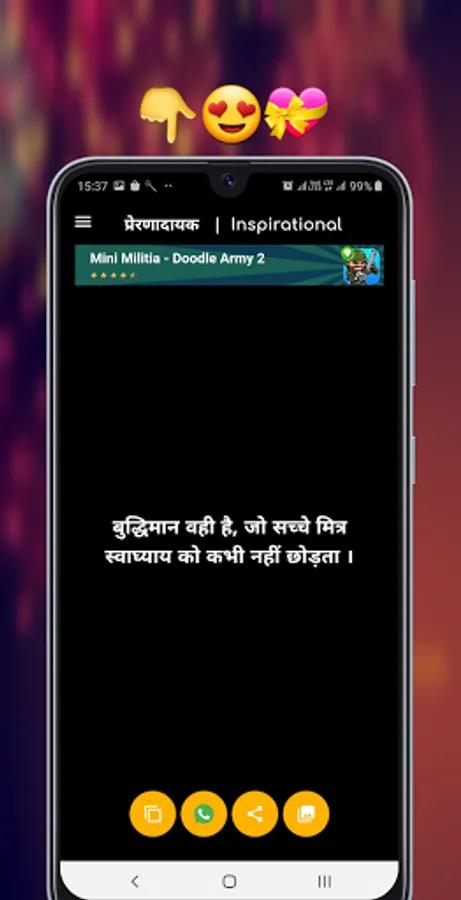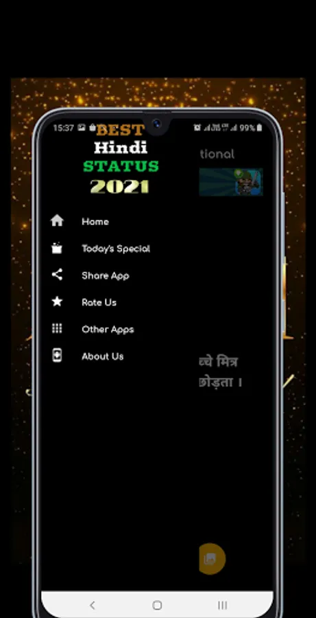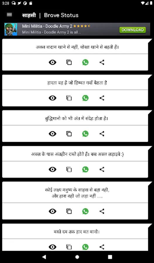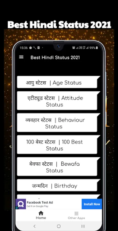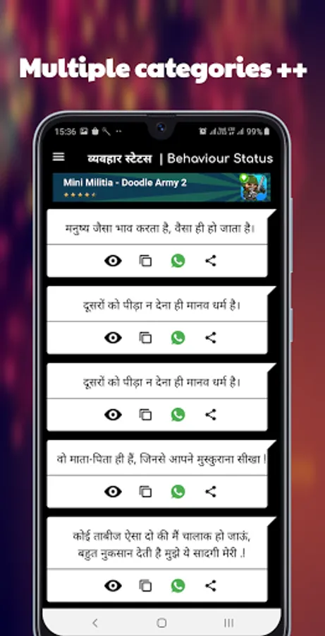The best status in the Hindi app helps you stay in touch with family and friends. Hindi status app is a great collection of messages and quotes. There are 60+ status categories that give to complete freedom to choose messages/quotes according to your mood or occasion. Setting Good Status gets increased your likes on your post as well as able to Show Your mood and Attitude.