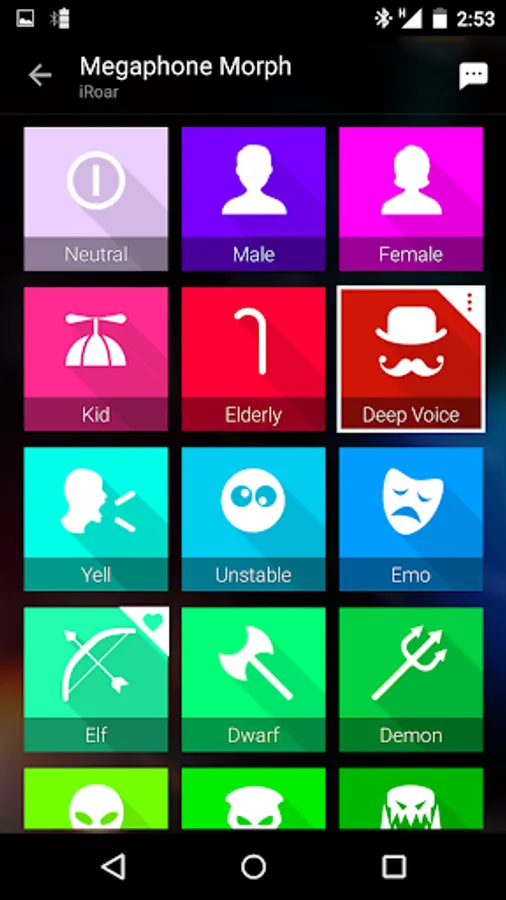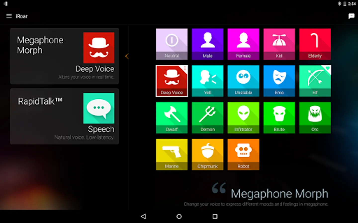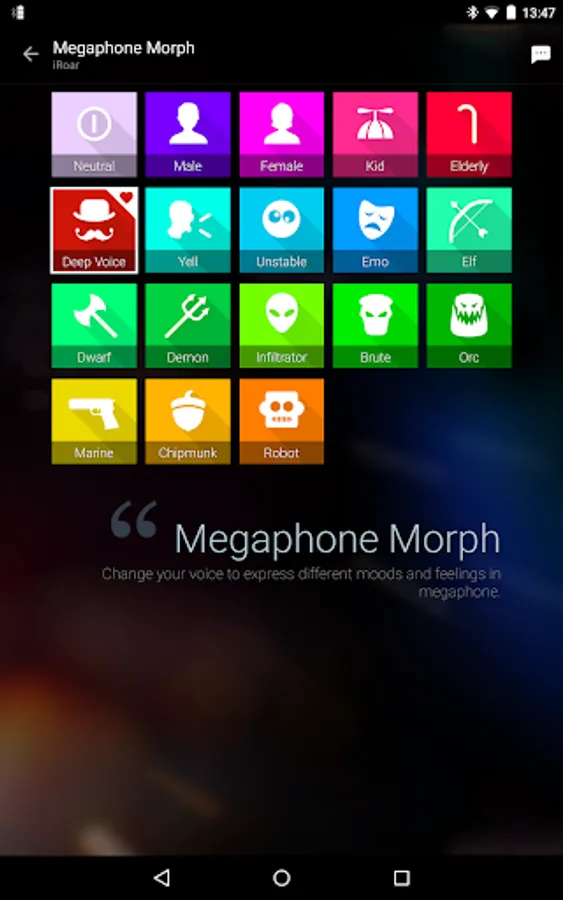 The iRoar Megaphone comes with the amazing Megaphone Morph, which can instantly change your voice into different characters, to make you sound like a completely different person. Try fun voices or sound effects like Male, Female, Kid, Elderly and Demon. Simply tap on a character available on the app and speak into your iRoar Mic!