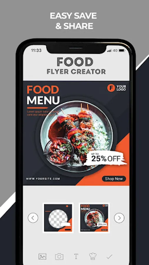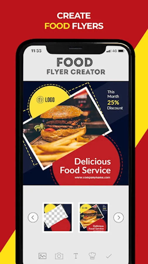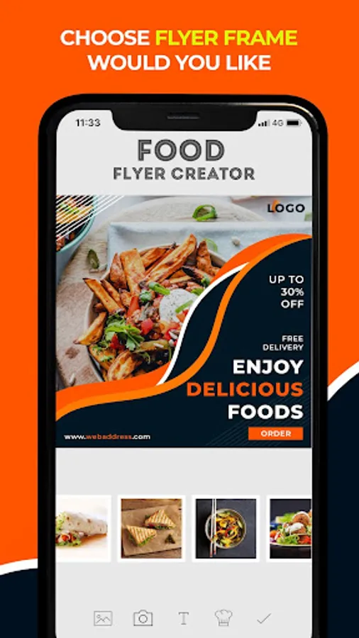 * Select image from your gallery and add adjust it behind flyer frame. Also you can place readymade food image from app and adjust it.