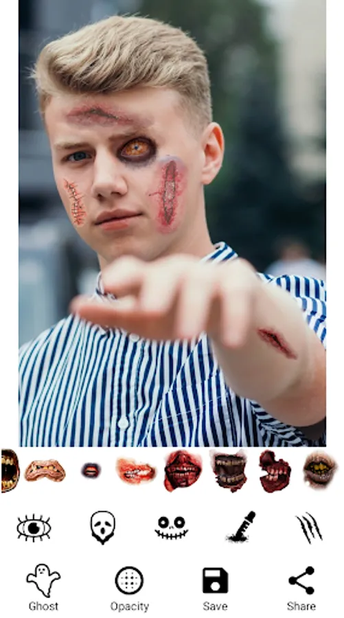This cool ghost app is free spooky photo editor, which will help you make incredible zombie picture montages to scare your friends and family members and have a good laugh. This is a very easy and simple picture editor app that anybody can use – just take a picture using Ghost in photo editor booth or select one from your phone gallery, then choose the scary grossest stickers you can find in our favorite stickers collection for zombie zone photos with gross and eerie photo effects and adjust them to make a real scary ghost face and adjust them to make a real zombie face.