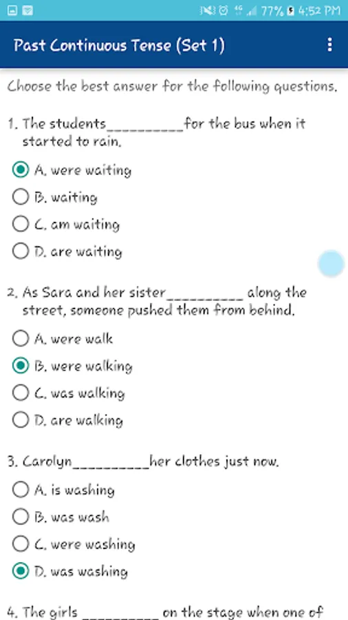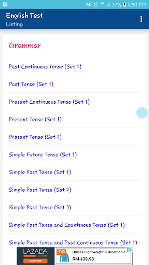 This app is easy to use to test your English understanding. All you need to do is start the quiz and answer all 10 questions (Multiple Choice) per set, get the result and check the answers. It's fun.