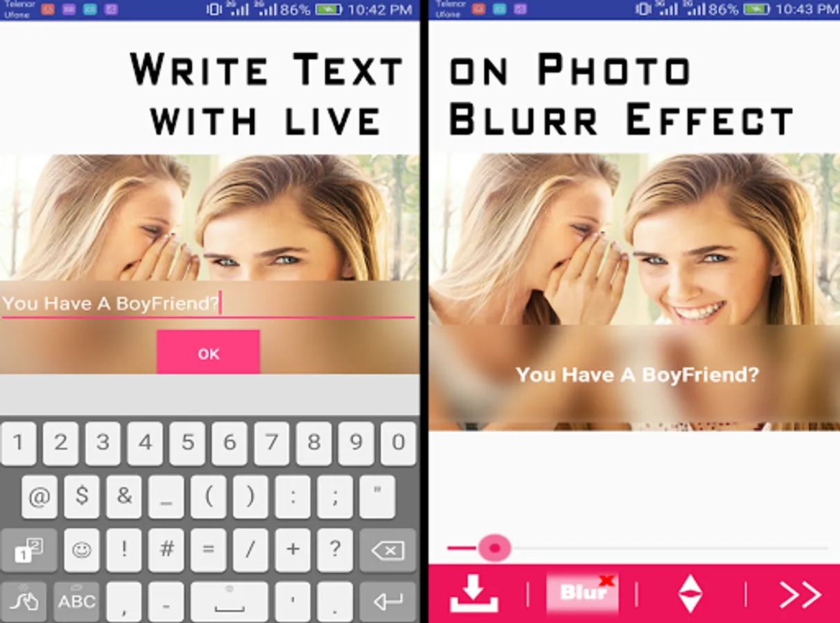 One of the best thing is live Blur effect on photo,tap on text to write any Title/Text on it and move it to adjust blurred area on photo.