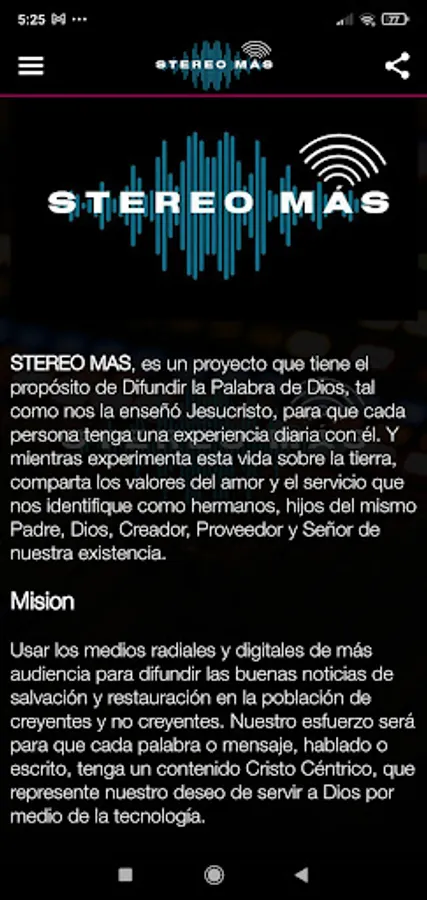 STEREO MAS, es un proyecto que tiene el propósito de Difundir la Palabra de Dios, tal como nos la enseñó Jesucristo, para que cada persona tenga una experiencia diaria con él. Y mientras experimenta esta vida sobre la tierra, comparta los valores del amor y el servicio que nos identifique como hermanos, hijos del mismo Padre, Dios, Creador, Proveedor y Señor de nuestra existencia.