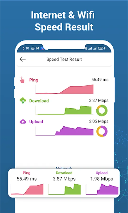 Use Wifi Info - Internet SpeedTest to test your internet speed and check network performance. Only just one Click, it will test your internet connection through thousands of servers worldwide and show accurate results. Wifi Info - Internet SpeedTest is a free internet speed meter. It can test speed for 2G, 3G, 4G, 5G, DSL, and ADSL etc.It's also a wifi analyzer that could help you test wifi connection.