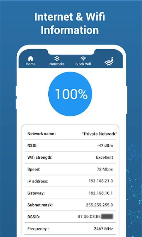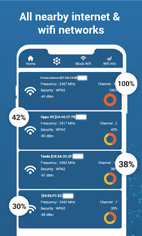 This Wi-Fi analyzer provides useful information about wireless signals around you.Enjoy Wifi Info - Internet Speed Test and everything with fast internet connection!