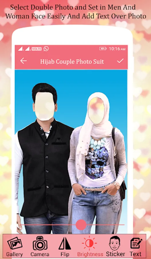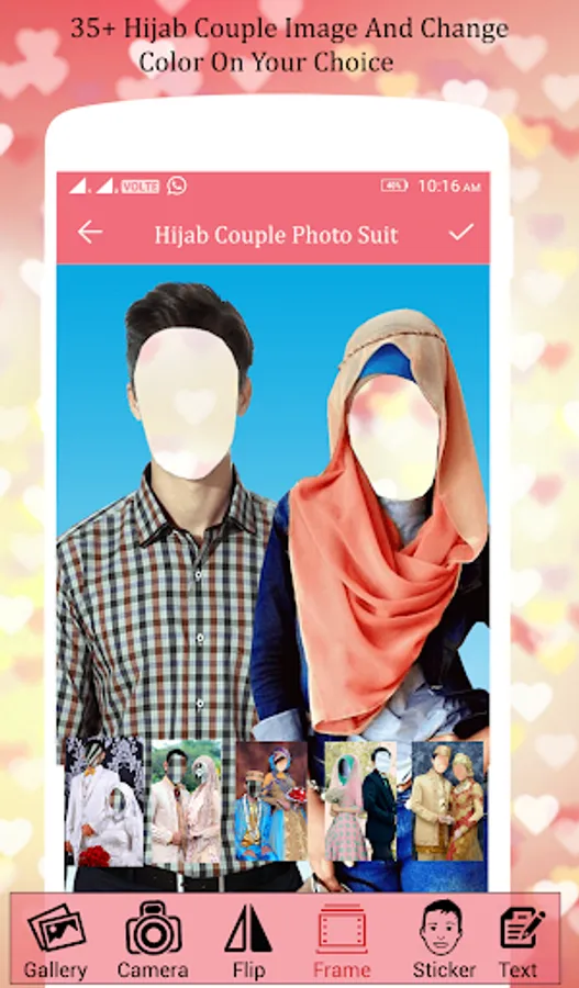 This app include different designs of Muslim women and men dresses like sherwani, hijab suits combine like couple photo suit editor.