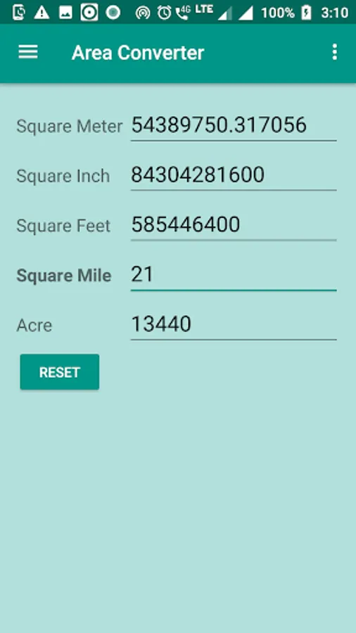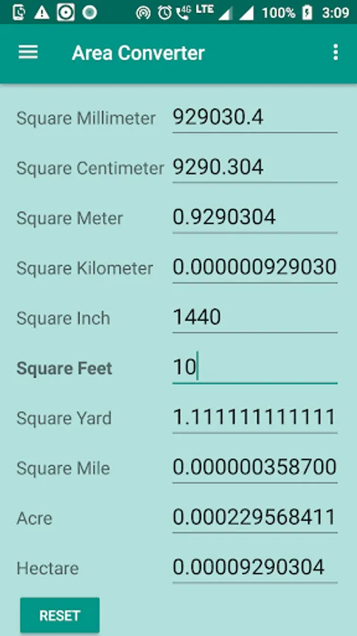 Hectare , Acre , Square mile , Square Yard , Square Feet , Square inch , Square Km , Square meter , Square Centimeter , Square millimeter.
