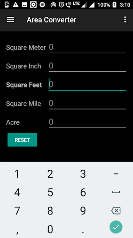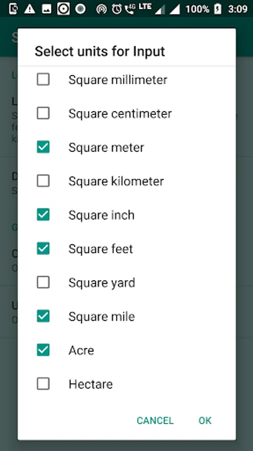Units included are : sq mm, sq cm , sq m , sq km , sq inch , sq feet , sq yard , sq mile , acre , hectare .