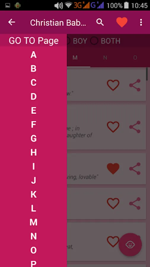 - Can look through baby names alphabetically with separate screen for each alphabet .Swipe right or left to go to next alphabet.