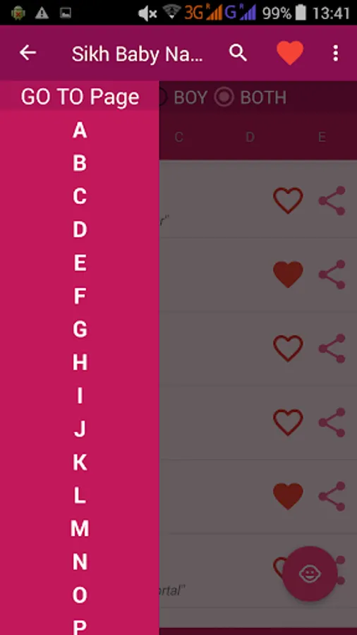 - Can look through baby names alphabetically with separate screen for each alphabet .Swipe right or left to go to next alphabet.
