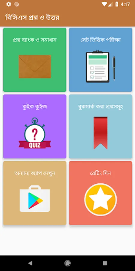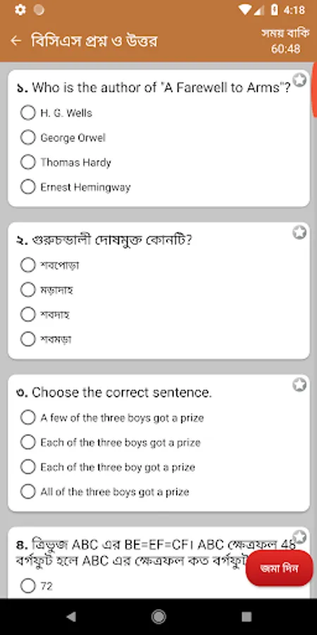 ৪১তম বিসিএস পরীক্ষার প্রস্তুতি নেয়া সময় শেষ হয়ে এসেছে। বিসিএস প্রিলিমিনারি পরিক্ষার প্রস্তুতি নেয়ার সুবিধার্থে এবং বিসিএস মডেল টেস্ট পরীক্ষার সহায়ক হিসেবে আমরা বানিয়েছি বিসিএস প্রশ্ন ব্যাংক ( bcs question bank and solution 10-40 অ্যাপটি। বিসিএস প্রিলি প্রস্তুতি নেয়ার ক্ষেত্রে বিসিএস সাধারণ জ্ঞান,কম্পিউটার, বিজ্ঞান, বাংলা সাহিত্য, ভূগোল , ইতিহাস, গনিতের শর্টকার্ট এই সবগুলি বিষয়াদীর ক্ষেত্রে বেশ গূরুত্ব দেয়া উচিত। বিসিএস ডাইজেস্ট (bcs preliminary digest) এর মত কাজ করবে আমাদের এই অ্যাপটি। প্রিলি পরবর্তী ধাপে বিসিএস লিখিত প্রশ্ন ব্যাংক বেশি করে অনুশীলন করতে হবে। বিসিএস সিলেবাস জানা থাকলে বিসিএস প্রস্তুতি (41th bcs preparation) নিতে সুবিধা হয়। বিসিএস মানসিক দক্ষতা অর্জনে ও সহায়ক হবে আমাদের অ্যাপটি।