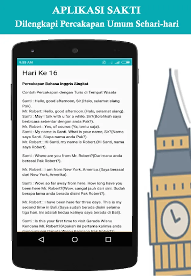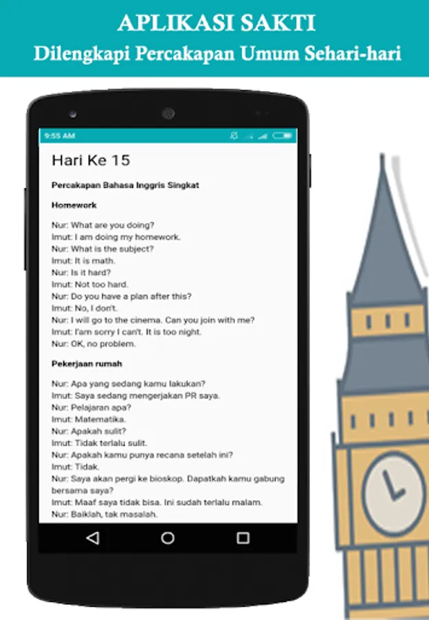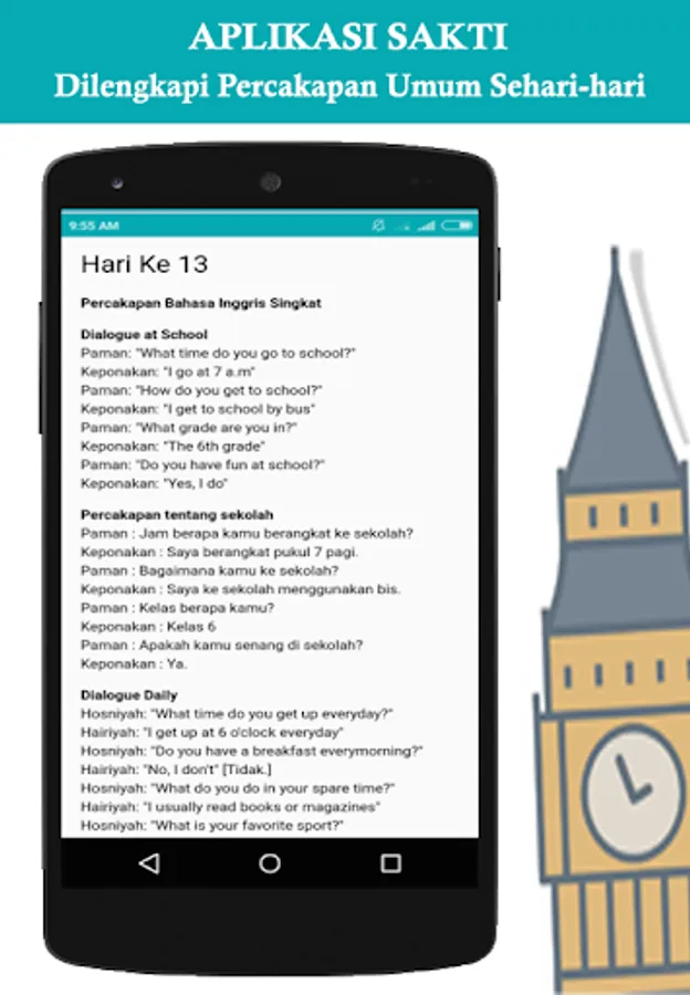Anda juga dapat belajar bahasa inggris sehari hari karena di dalam aplikasi ini juga terdapat beberapa dialog bahasa inggris dasar untuk pemula.