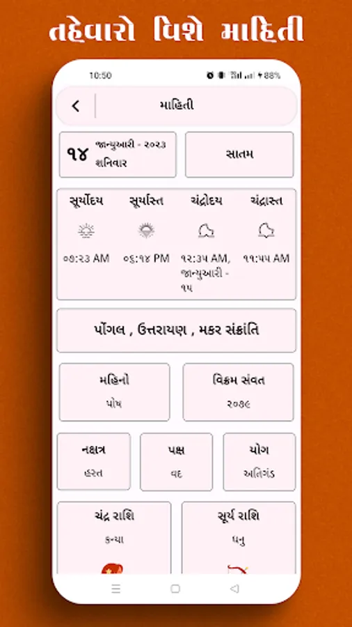 ગુજરાતી કેલેન્ડર ૨૦૨3 માં તમે તિથિ પંચાંગ, જાહેર રજાઓ,તહેવાર,ચોઘડિયા, રાશી, નક્ષત્ર અને કાળ, વગેરેના મૂહર્ત વગેરેની વિગતવાર માહિતી મેળવી શકશો.