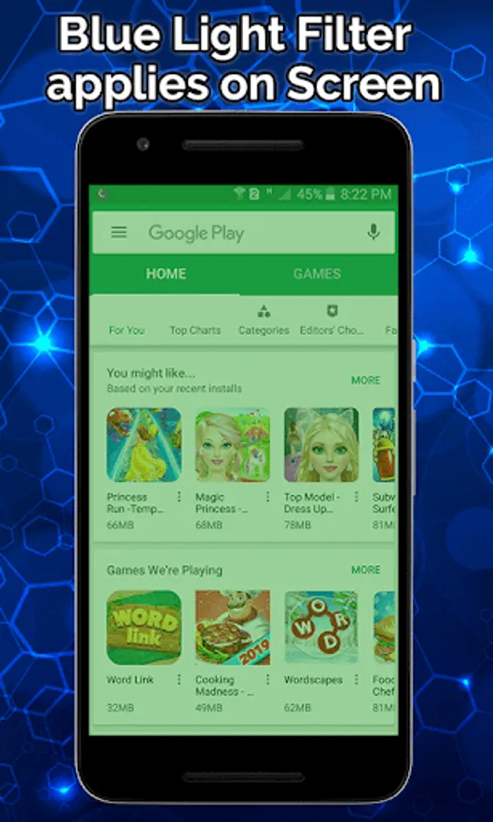 At dark mode you can easily interact with mobile without any fear of causing eyestrain because at night screen brightness is more when light is turn off and using mobile for a while eye start soring and disturb sleeping but by using filter warmlight or light guard you have no problem. By using eye protect or screen filter at Night mode (dark mode) your eye will be protected from uv light (uv protect) and your sleep will not be affected because of use of warmlight.
