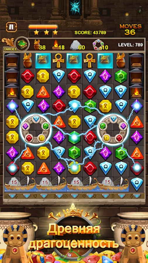 This free match 3 game fully supports Russian. So start your search, look for lost gold and treasures in the Temple of the Pyramid and restore the civilization of Ancient Egypt!