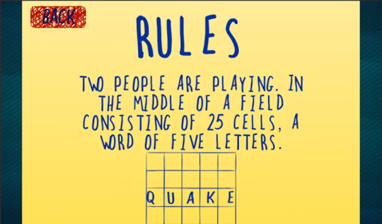 Two people are playing. In the middle of a field consisting of 25 cells, a word of five letters. You must add new letter at field and make new word. Every word from word add points to your score. In turn every player make steps while in the field there are free cells. The winner is the one who has the largest score.