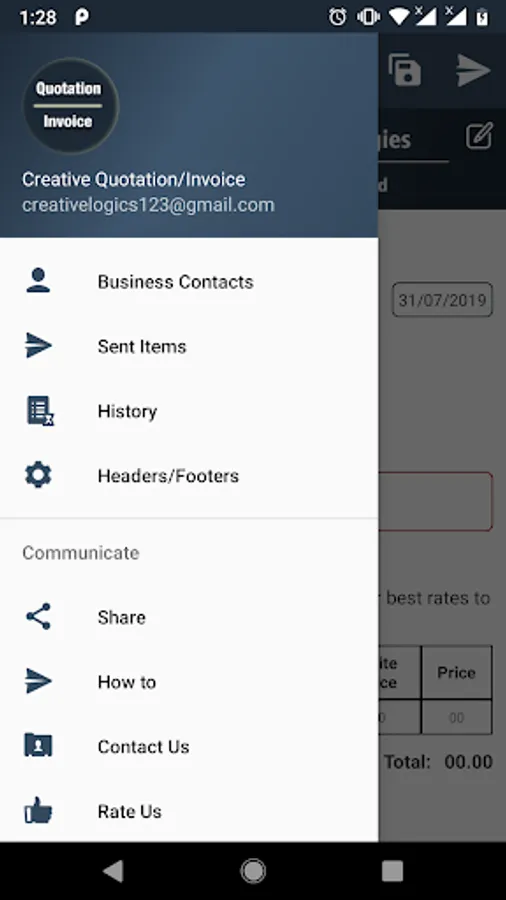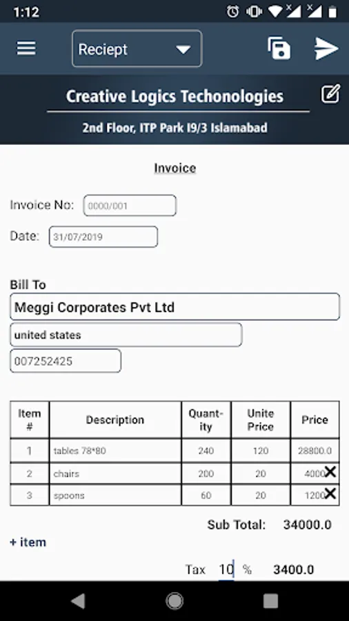 Write your business services or business goods with description and rates to your business items list and use it quickly in quotation or invoice/receipt by just tapping on your item from the saved list.