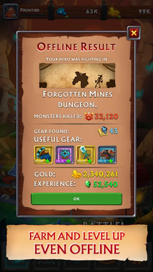 Nonstop Battling, Your hero fights and levels up day and night, even when you are offline