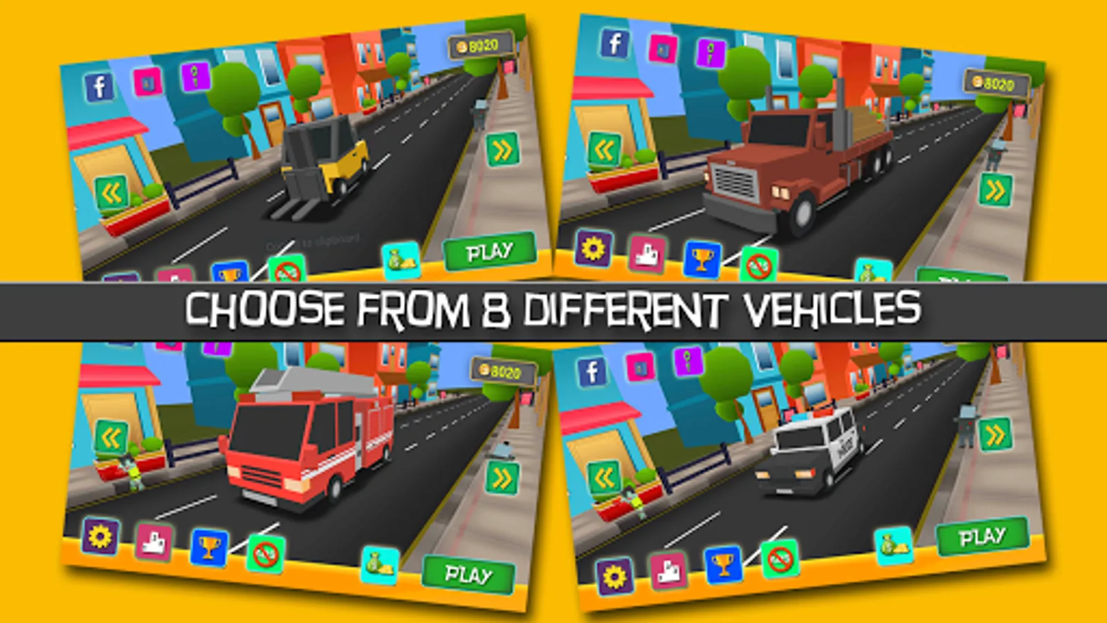 I HATE HIGHWAY ZOMBIES is an endless 3D toonic action game that combines both traffic racing and zombie smashing game play. It's a never ending survival game. The challenge is to survive against the zombie attacks on the blocky highway and race between the traffic vehicles without hitting. You will be rewarded with gold coins on smashing zombies and can unlock the powerful vehicles (Car, SUV, Sedan, Retro Car, Forklift, Police Car, Tow Truck, Heavy Duty Truck and Fire Engine) and environments.