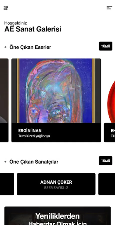 AE Art Gallery has adopted the principle of continuously exhibiting the works of master artists who have guided Turkish Modern and Contemporary Art of Painting, bringing them together with art lovers and bringing new names to the Turkish Contemporary environment. AE Art Gallery also provides consultancy and expert services.