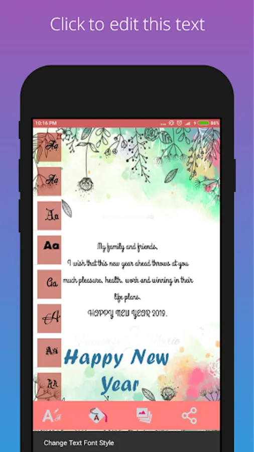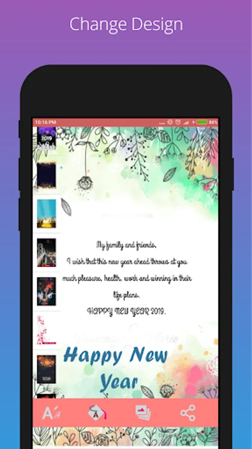 NewYearCardMaker lets you create beautiful cards for your friends and family. There are many option to create and customize the cards. you can choose from variety of cards and make them beautiful.