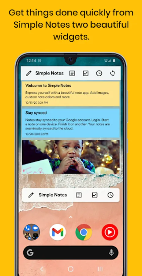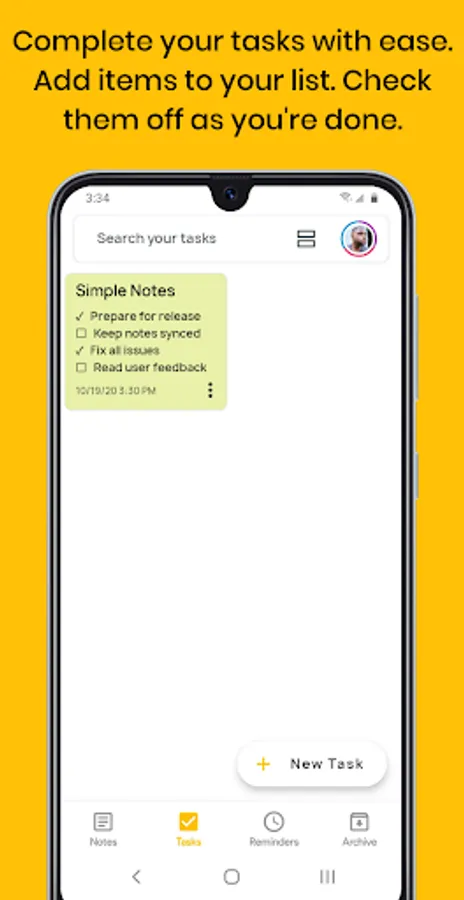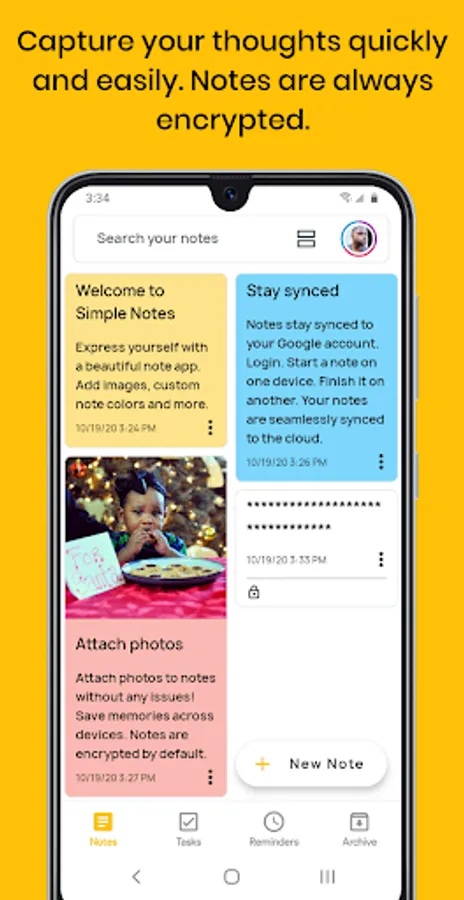 Capture what's on your mind when the moment strikes! Jotting down your ideas is quick and easy with Simple Notes. Write a note. Create a task. Set a reminder. Archive a note. All actions sync to the cloud so your changes become available instantly on all of your devices. Simple Notes sync with your Google account to make syncing easy.