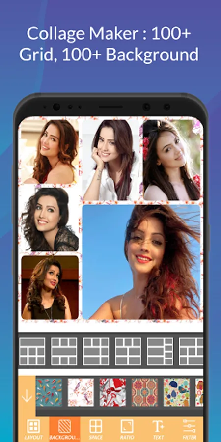 + Collage maker with 100+ layouts and 100+ designed backgrounds;