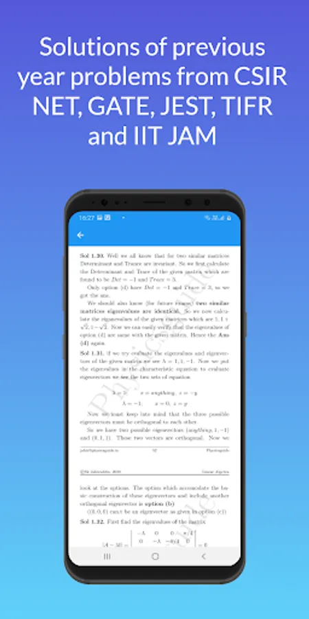 The problems we discussed are from CSIR NET (June 2011-Present), GATE (2006-Present), IIT JAM (2006- Present), JEST (2012-Present), TIFR (2010-present). There are currently more than 3000 solved problems in this app.