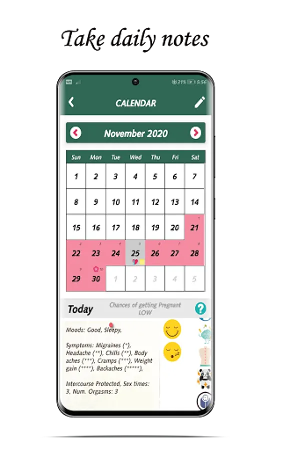 - The daily tracker lets you save information on flow, intercourse, symptoms, moods, temperature, weight, medicine, PMS, other diary notes