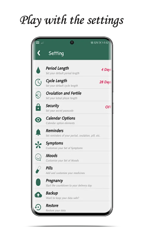 - Switch mode to pregnancy if you get pregnant and customize the calendar