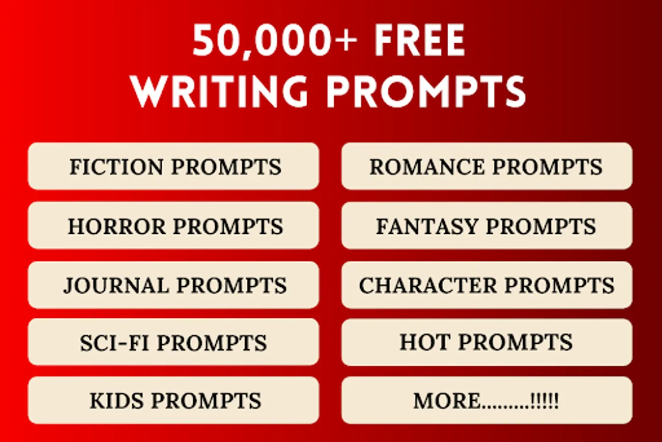 The fiction prompts cover a range of genres, including literary, mystery, thriller, suspense, science fiction, fantasy, paranormal, horror, romance, historical, humor, satire, children’s and young adult.