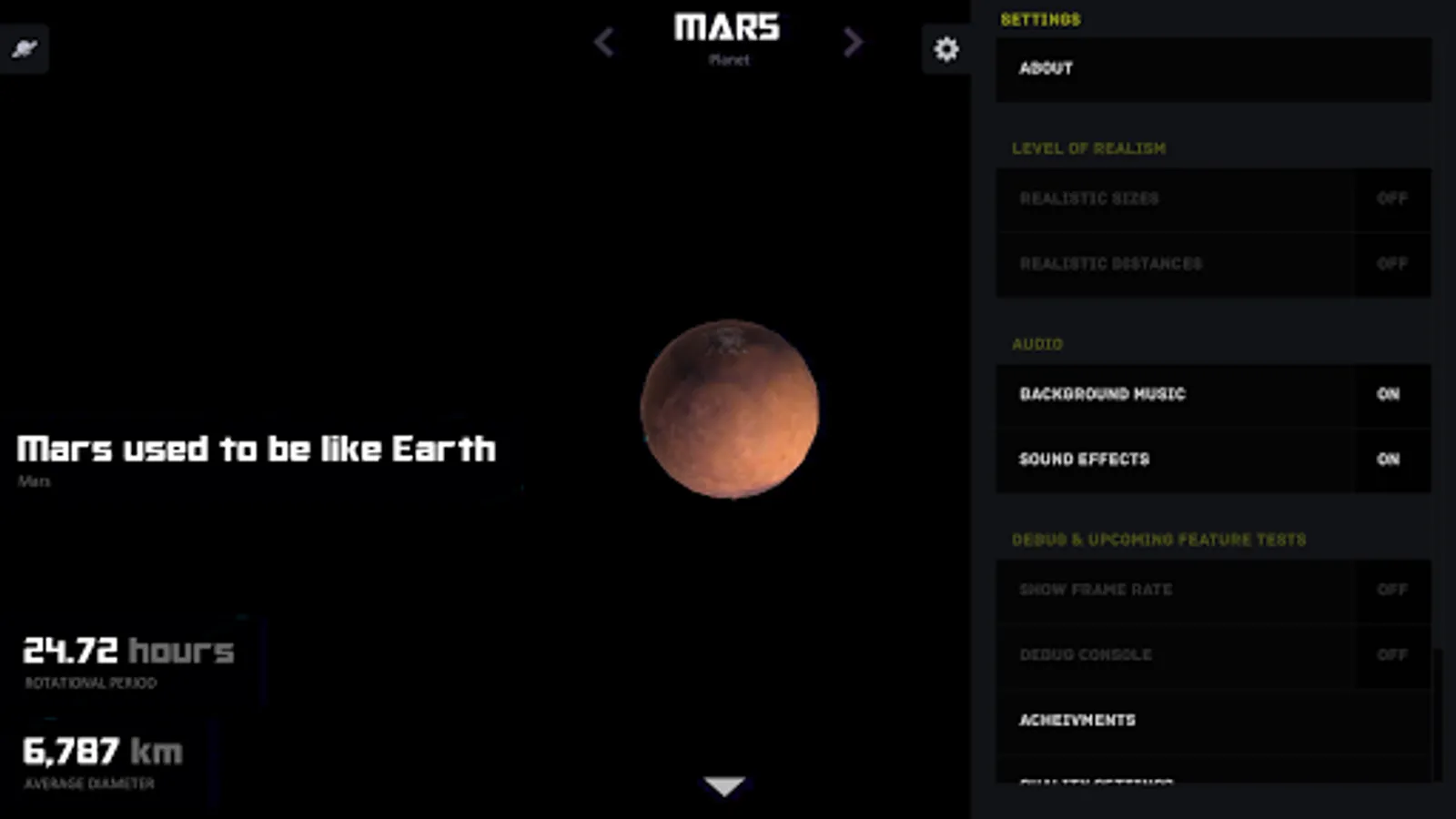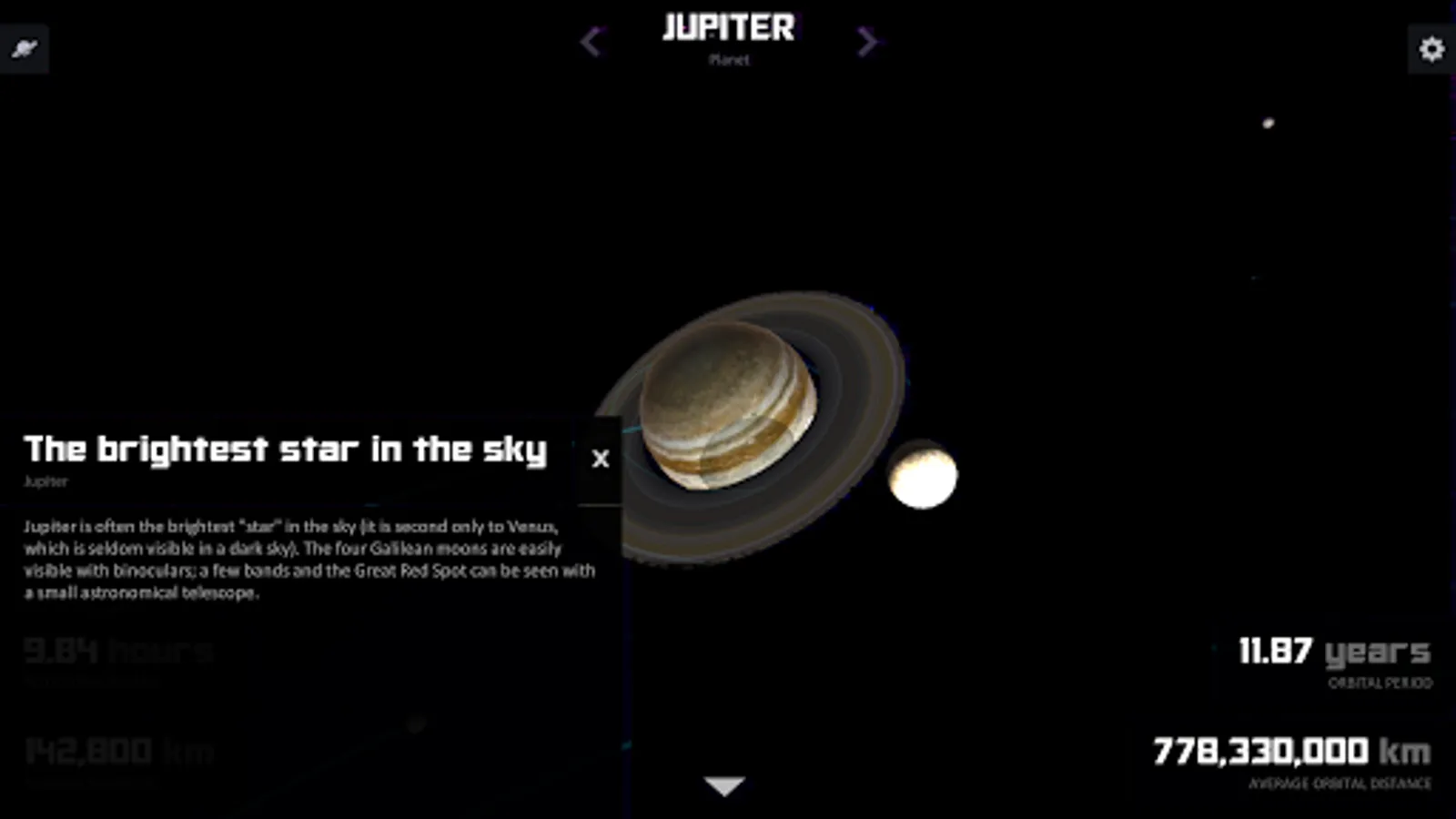 Planets are built to scale and textured true to life, with information about its radius, composition, distance from Sun, number of moons, rotation around the axis and orbital period.