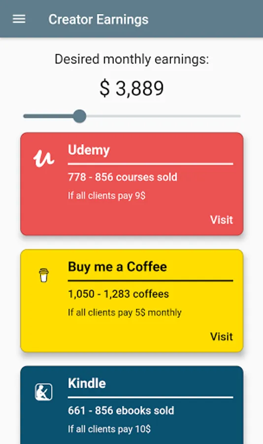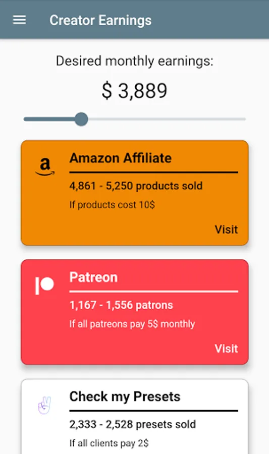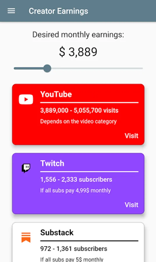 With Creator Earnings, you can easily calculate how many views, subscribers or sponsors you need to reach your monthly income goals on different digital platforms. The app is very easy to use, just select the platform you're interested in and use the slider to set the monthly income you want to earn!
