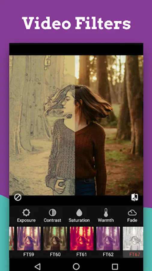 * 60+ Video filters, adjust video exposure, saturation, etc., add vignette.