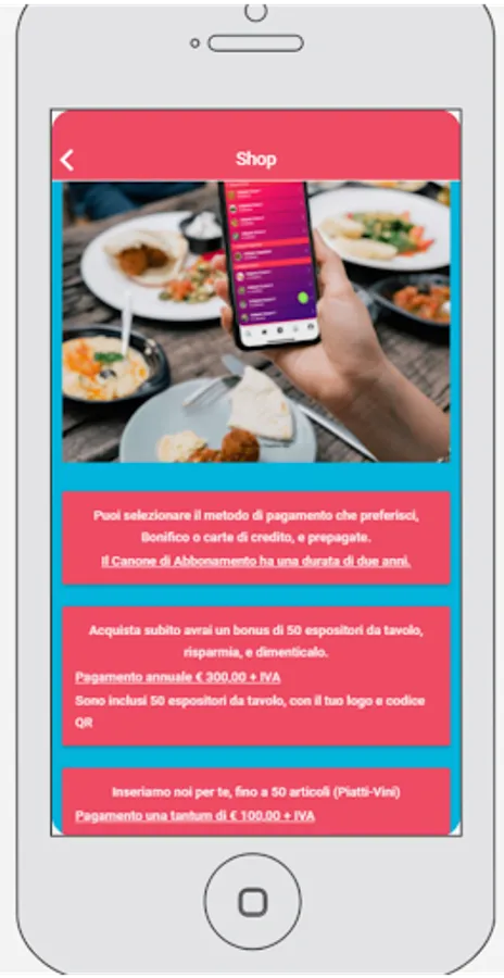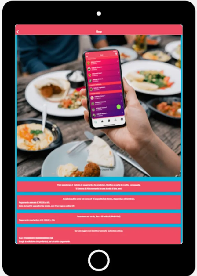 Through a QR-code generated by the Application for each Activity, the potential customer displays the digital and interactive Menu without downloading any software, through which to Order, and make the Payment, based on the settings defined independently by each individual activity.