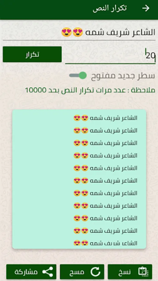 7 - Text or message repetition feature You can write a message and choose the number of repetitions and choose if the repetition is on a new line. You can repeat the message up to 1000 times