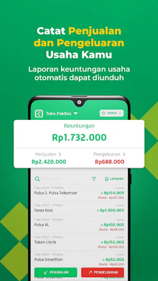 Dengan fitur ini, Bos bisa melakukan pencatatan harian secara online untuk setiap penjualan ataupun pengeluaran usaha. Setelah hari berakhir, Bos juga bisa mengunduh laporan keuntungan usaha di hari tersebut secara otomatis.