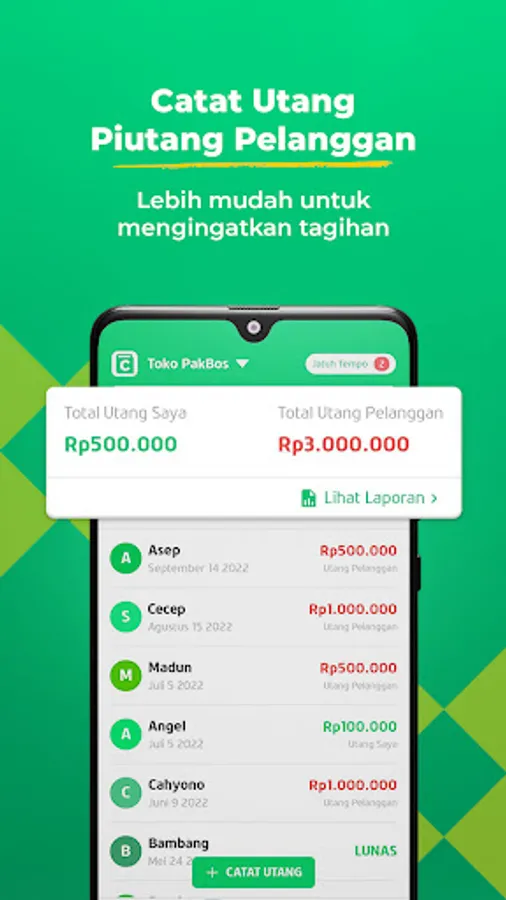 Setiap utang piutang Bos dan pelanggan, bisa dicatat lewat fitur ini. Bos juga bisa mengatur tanggal jatuh temponya.