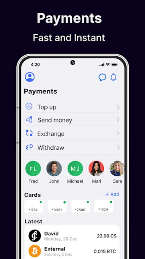 FAST: Sign up and make your first payment in minutes. Instantly send and receive money from friends. Transfer money from Credits App to an external IBAN account instantly instead of waiting days in traditional banks.