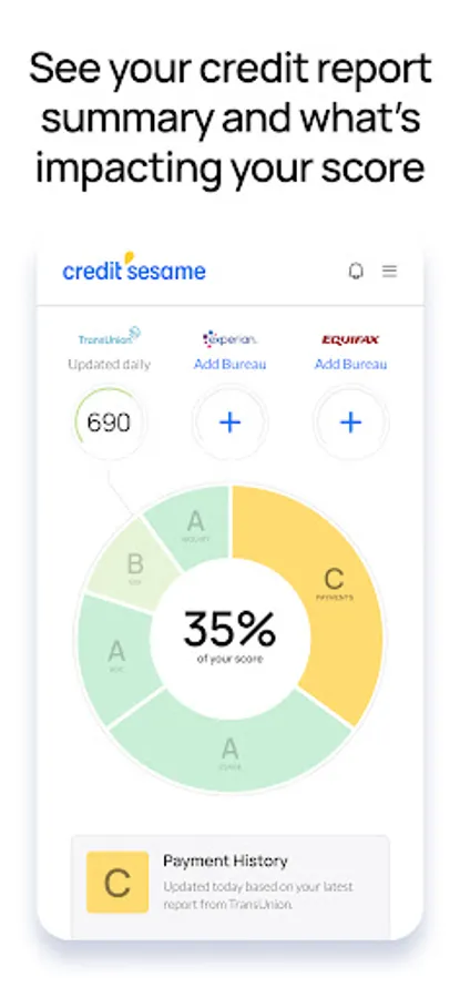 With a free Credit Sesame account, you get your TransUnion credit score right away, with personalized actions you can take to build positive credit history. We analyze your credit profile to find the best offers for credit cards and loans based on your chances of approval, projected credit score improvement, and potential savings.